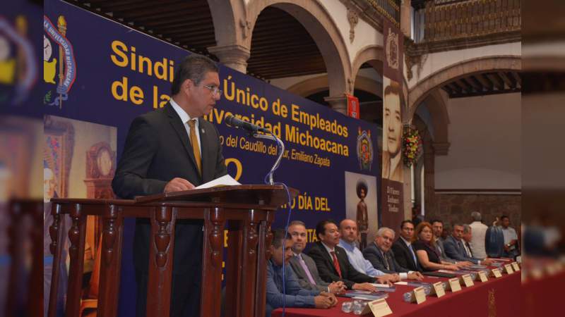 El Rector, ante representantes del Gobierno del Estado y Municipal, externó un sentido reconocimiento al trabajo desempeñado por las y los empleados nicolaitas pues “la grandeza de nuestra Universidad también está indisolublemente ligada a su trabajo y a su compromiso. En primer lugar porque impensable el reconocimiento de calidad educativa ante órganos externos que tiene nuestra universidad, sin la colaboración decidida de quien facilita las condiciones para que esto se lleve a cabo”.